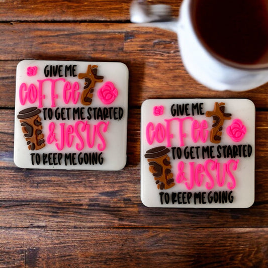 e611 - "Pink- Coffee Gets Me Started Jesus Keeps Me Going" Silicone Focal Bead (1 Count)