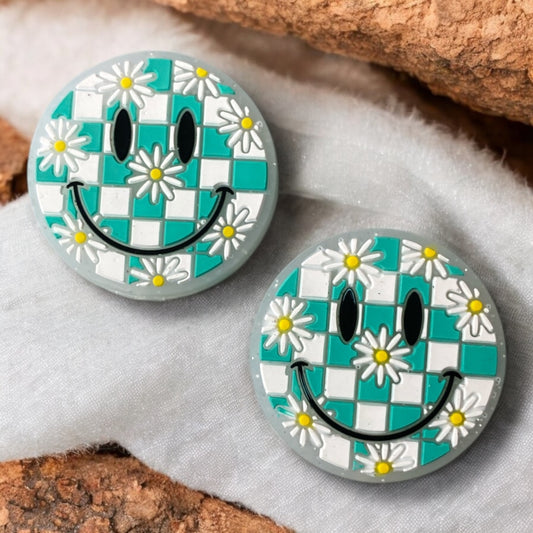 X58 - "Aqua- Checkered Happy" Silicone Focal Bead (1 Count)