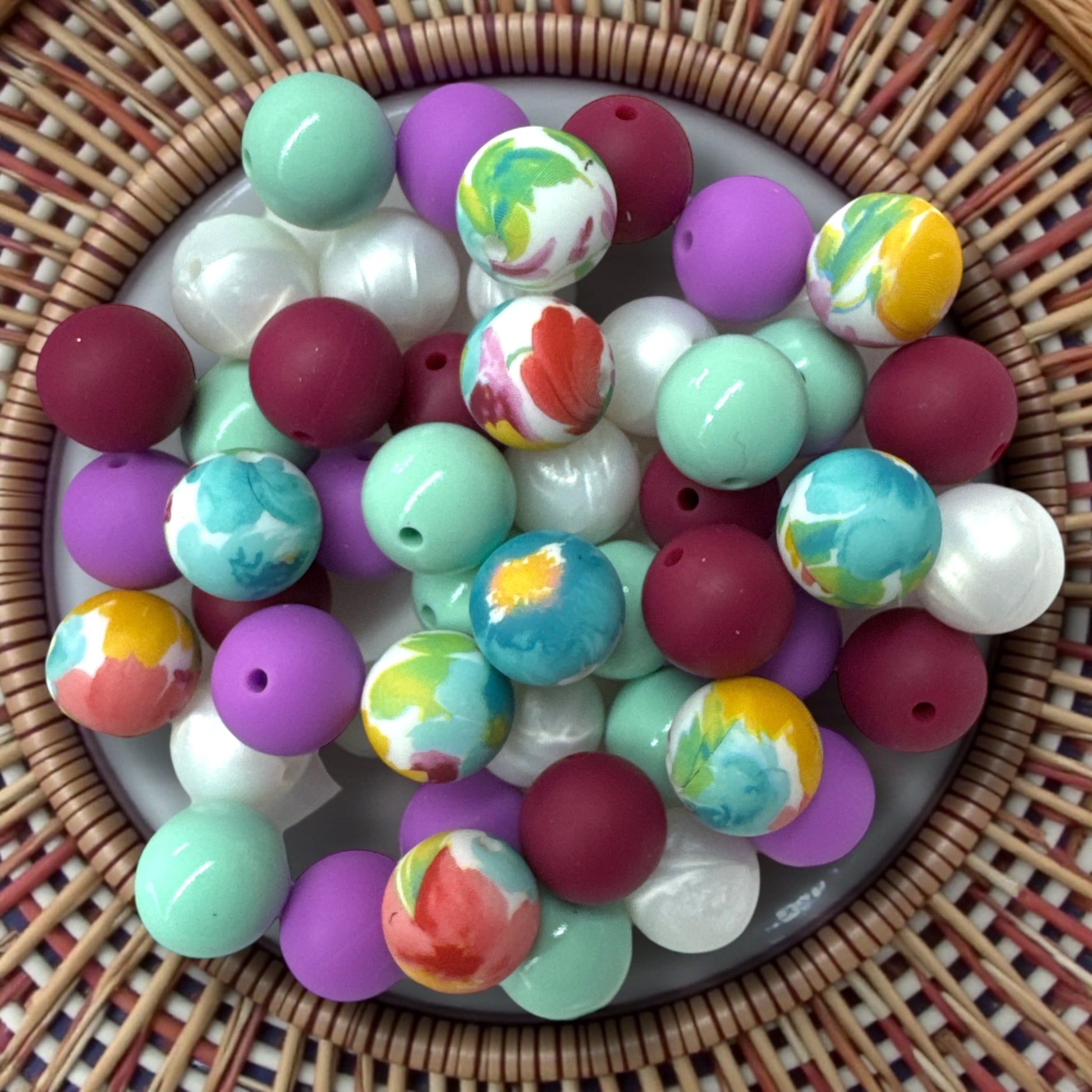 • Solid beads in white, burgundy, mint, and purple