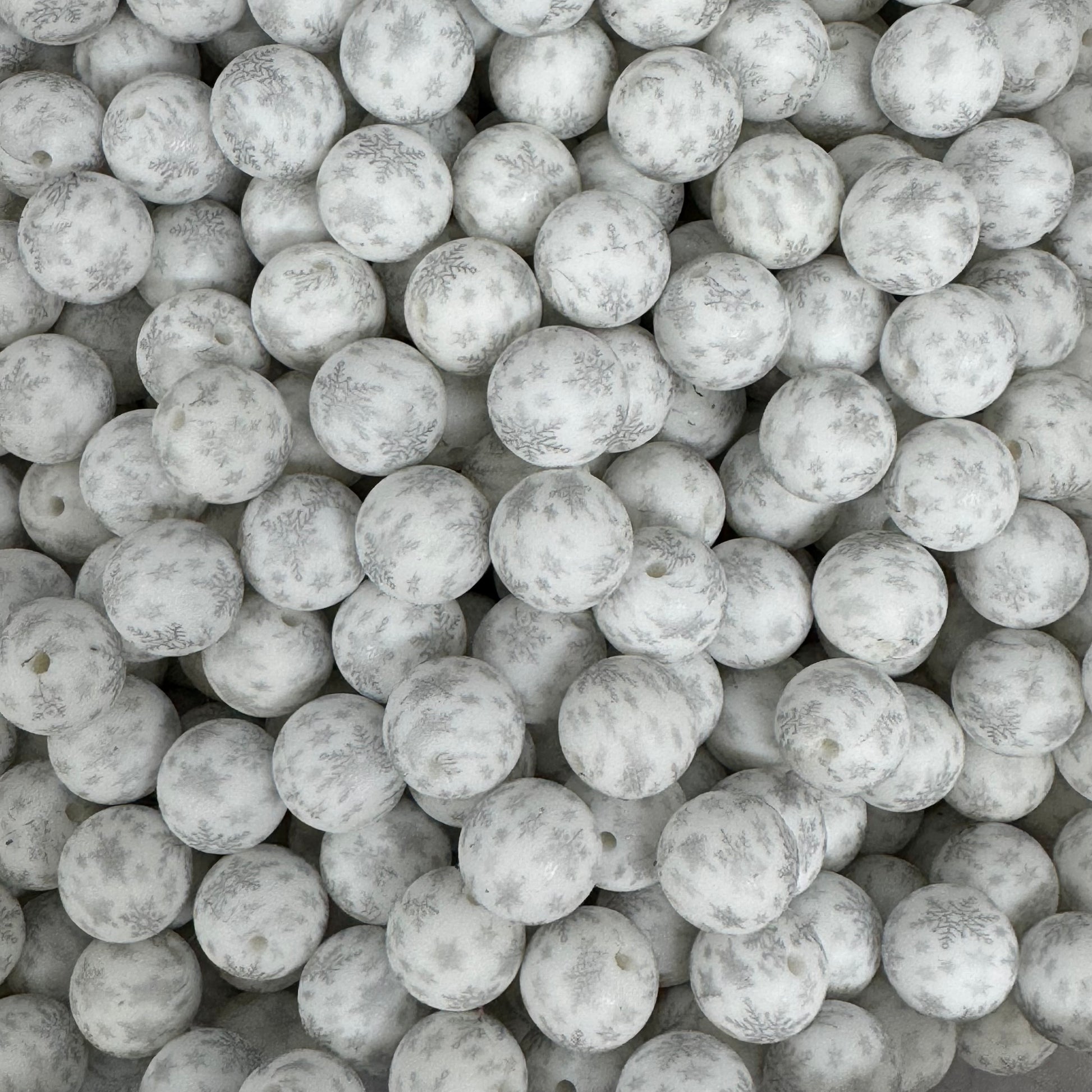 T81- 15mm “Silver & White Snowflakes” Silicone Beads